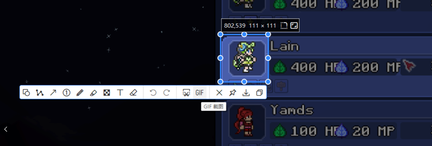 进入游戏,在角色界面,将人物移动动画使用 gif 保存下来。注意大小不要求,但是长宽得是一样的即正方形,不然 ps 读取不了。