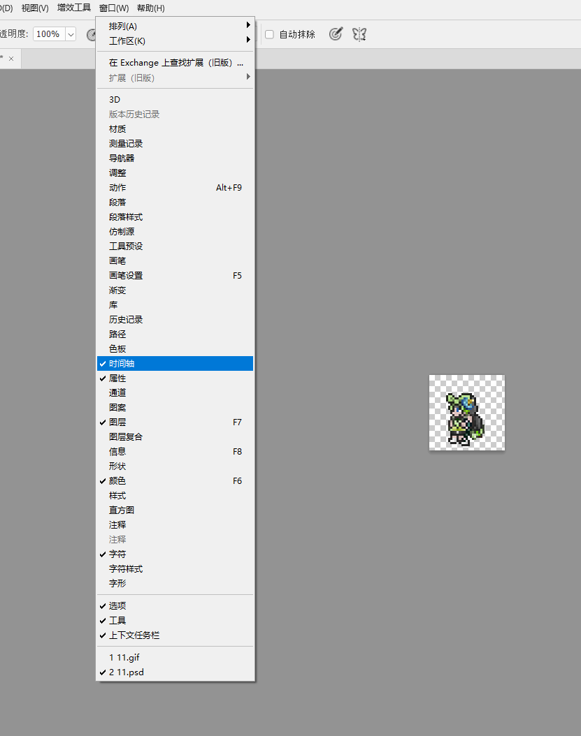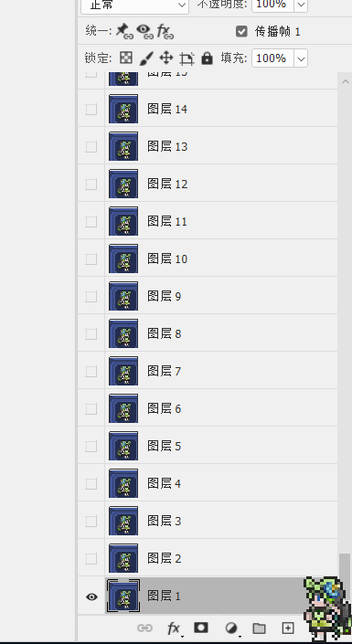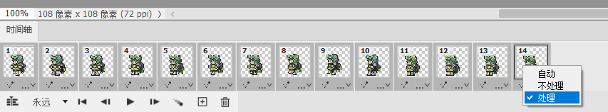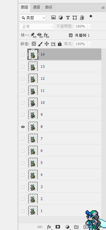 将 gif 导入 ps,gif 的帧转换为了图层,挨个查看图层,从起脚的那一帧开始,遇到重复帧则删除,整个动画一共有 14 帧,只保留这 14 帧,我个人习惯输入法放右边,所以左右镜像一下让角色朝向左边。
