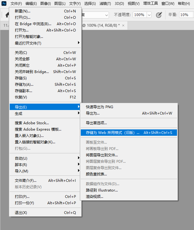 ps- 文件 - 导出 - 存储为 Web 所用格式(旧版),存储。