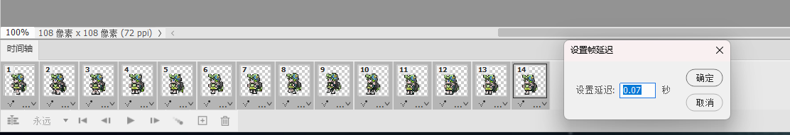 下方出现的时间轴里,一帧对应一个图层(选中某帧,在右侧图层中展示这一图层,其他图层隐藏),全选所有帧点击小角标,将延迟设为 0.07s,再右键全选的图像,设置为处理。